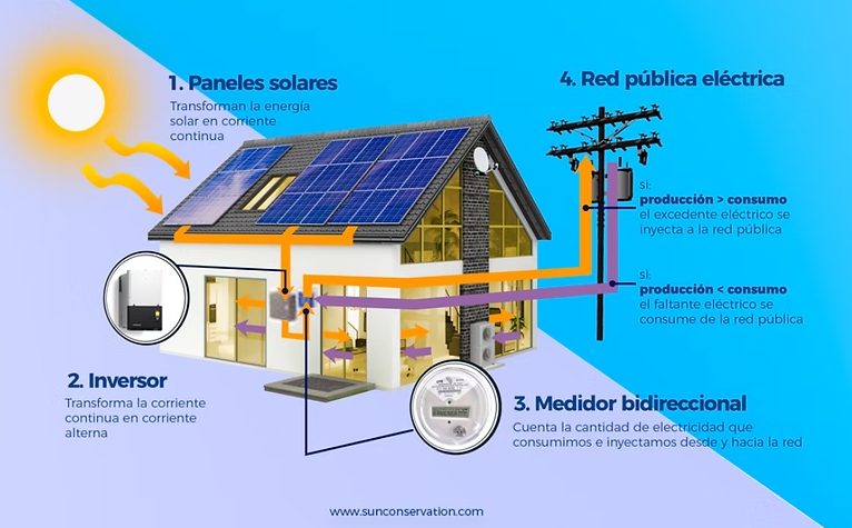 - Medición: Un medidor bidireccional registra tanto la electricidad consumida de la red como la electricidad enviada a la red.
